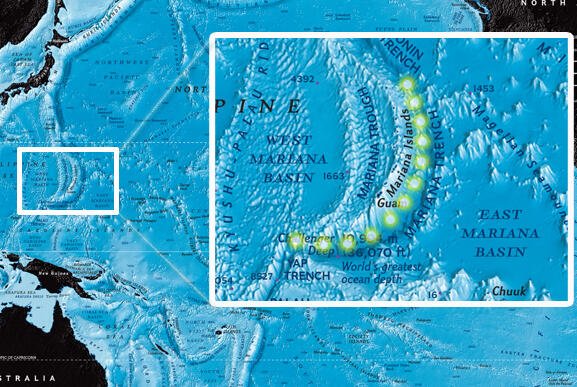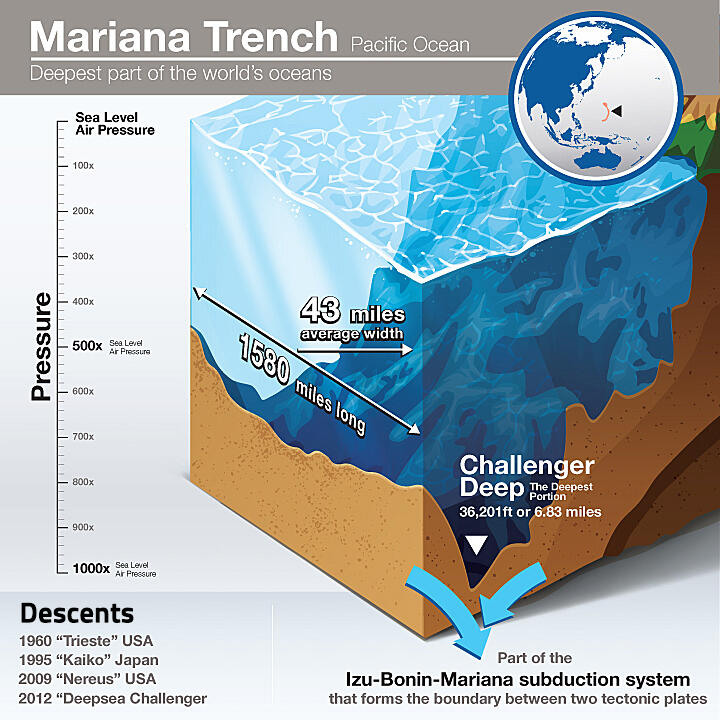 The Mariana Trench reaches more than 7 miles below the surface of the Pacific Ocean.